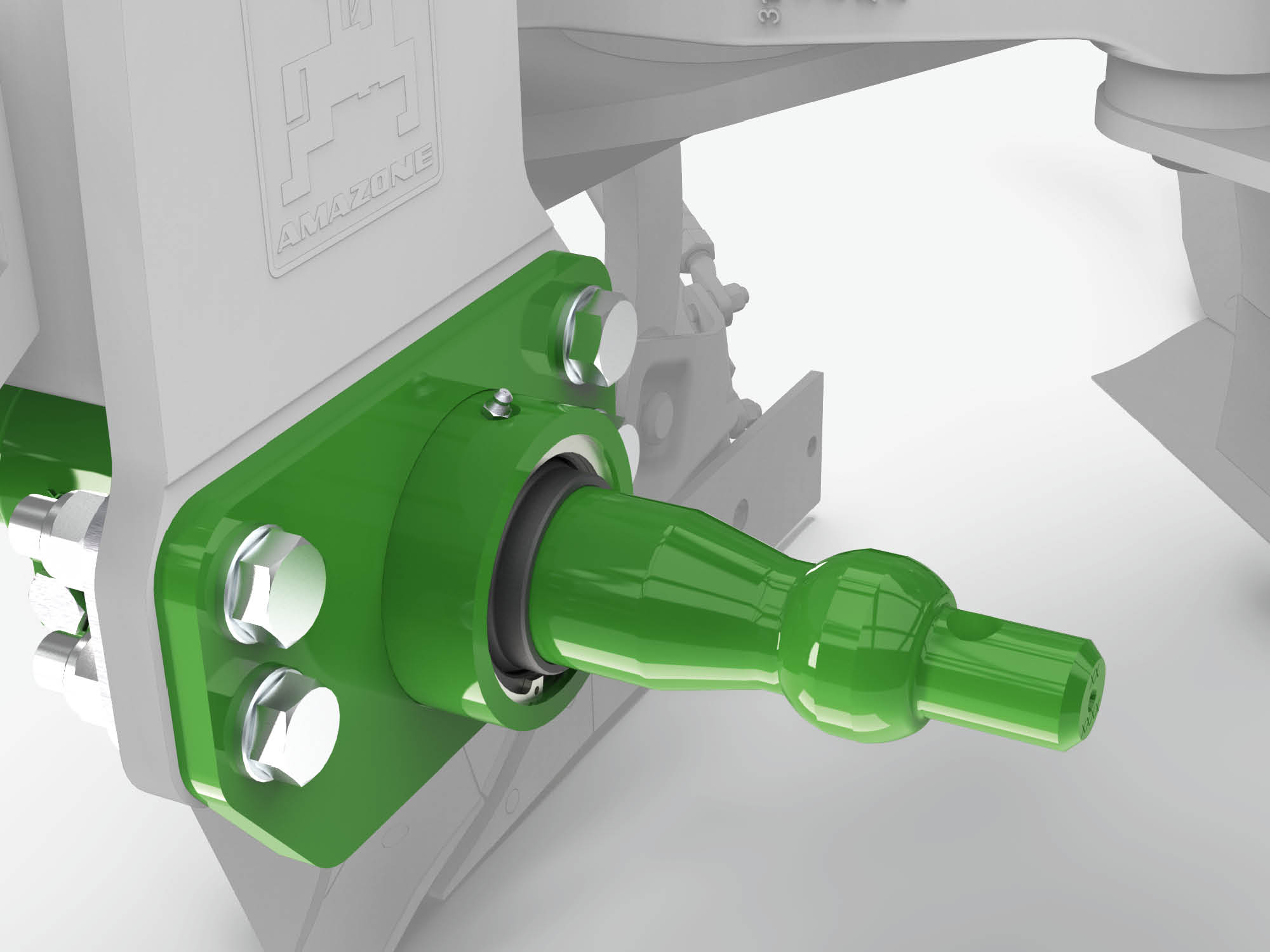 Установленная в подшипниках ось навески ProtectShaft с интегрированным шарикоподшипником обеспечивает низкий износ при максимальном ресурсе. Шарнирные подшипники оказывают демпфирующее действие и обеспечивают щадящий режим на разворотной полосе и при движении по общественным дорогам. Благодаря интегрированному шарикоподшипнику ресурс оси навески значительно повышается за счет большего диаметра. Альтернативно предлагается ось навески с неподвижно закрепленным болтом, улавливающими зажимными профилями Walterscheid и шарнирами.