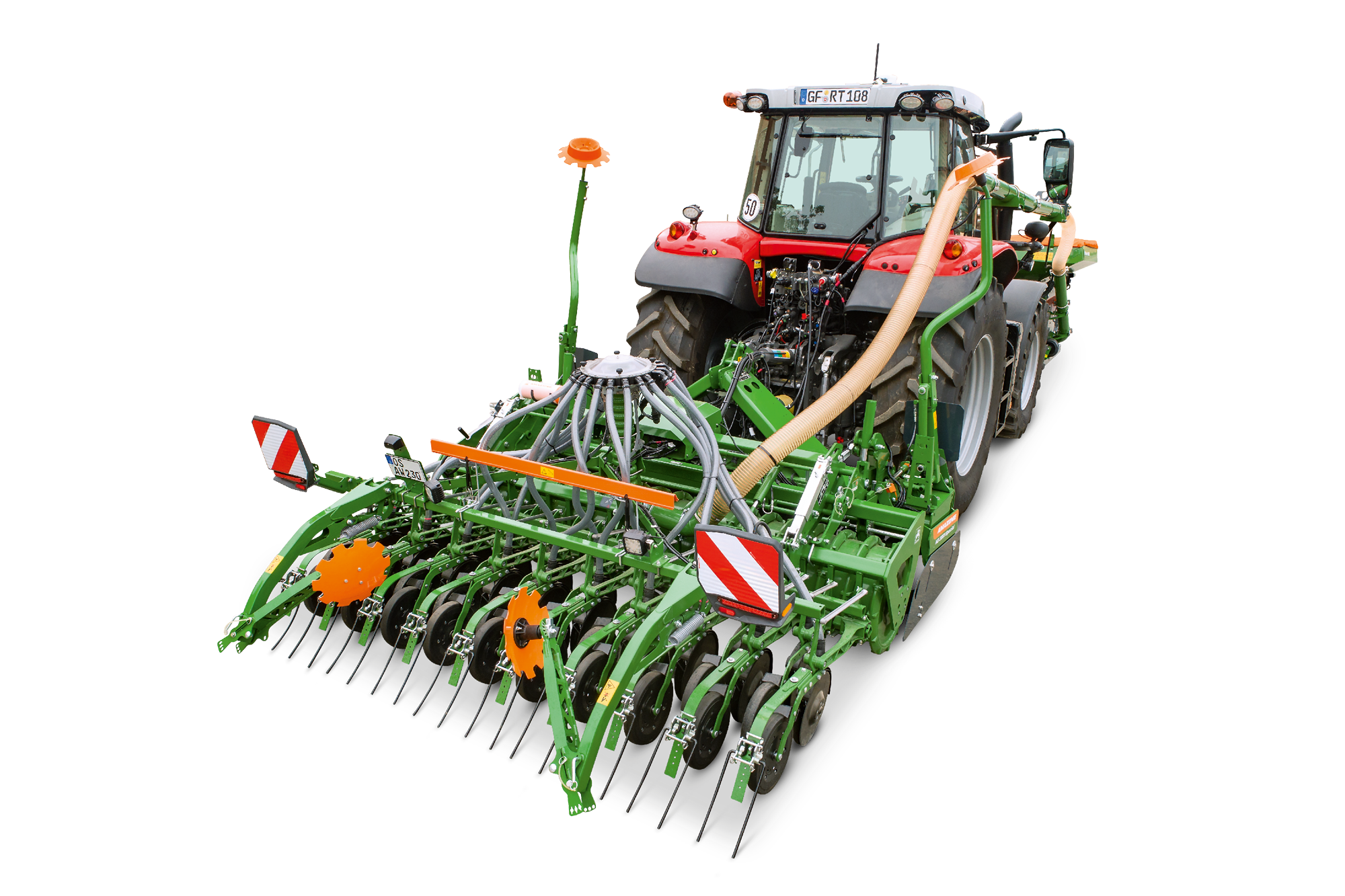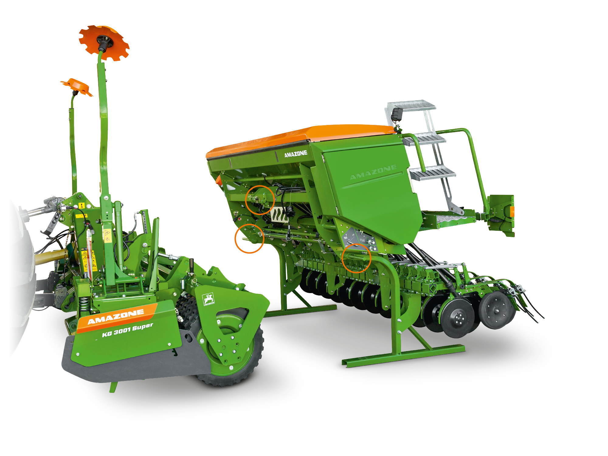 С помощью системы Huckepack к различным почвообрабатывающим машинам AMAZONE можно также присоединять навесную сеялку D9 - легко, быстро и без инструментов.