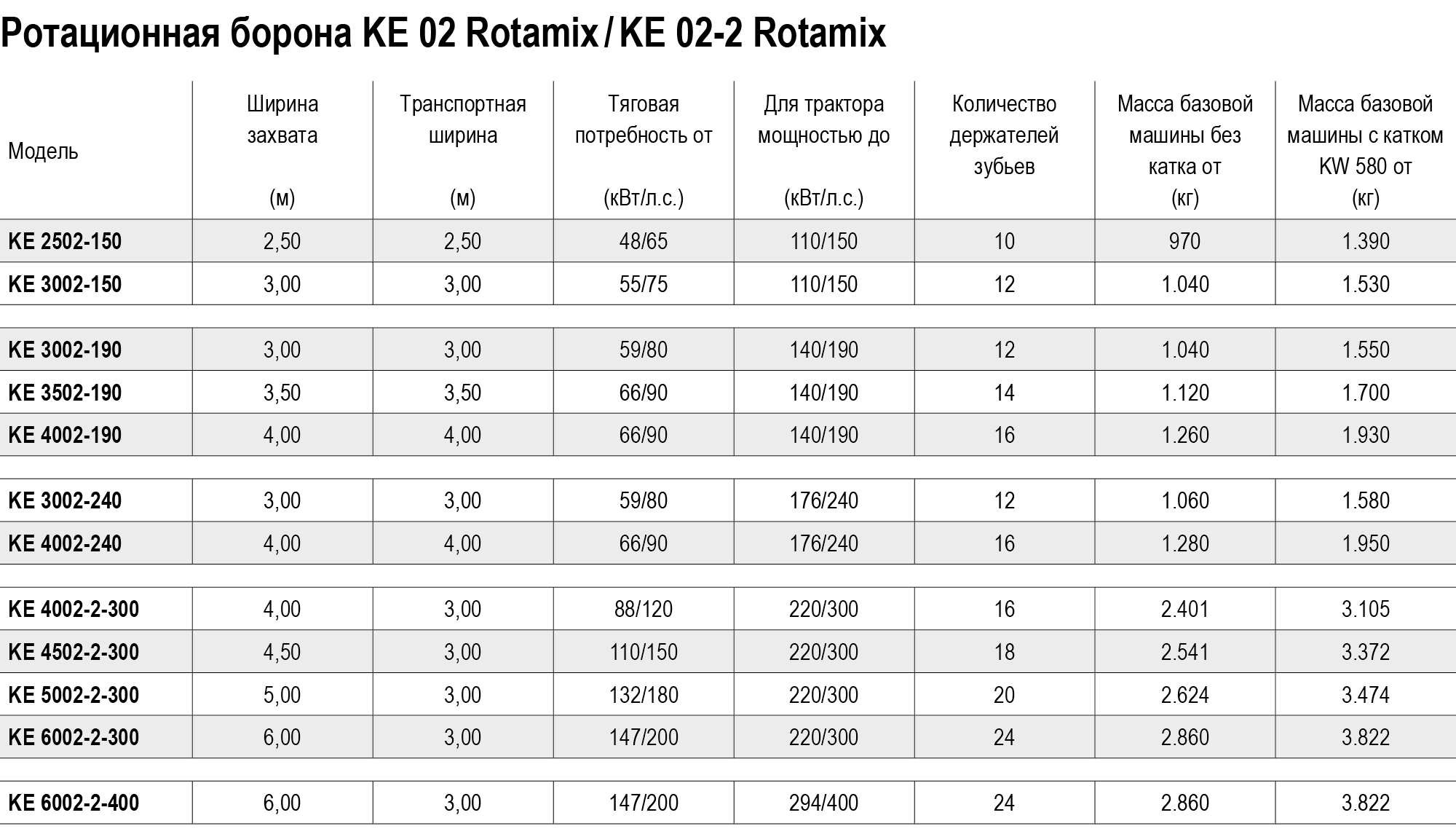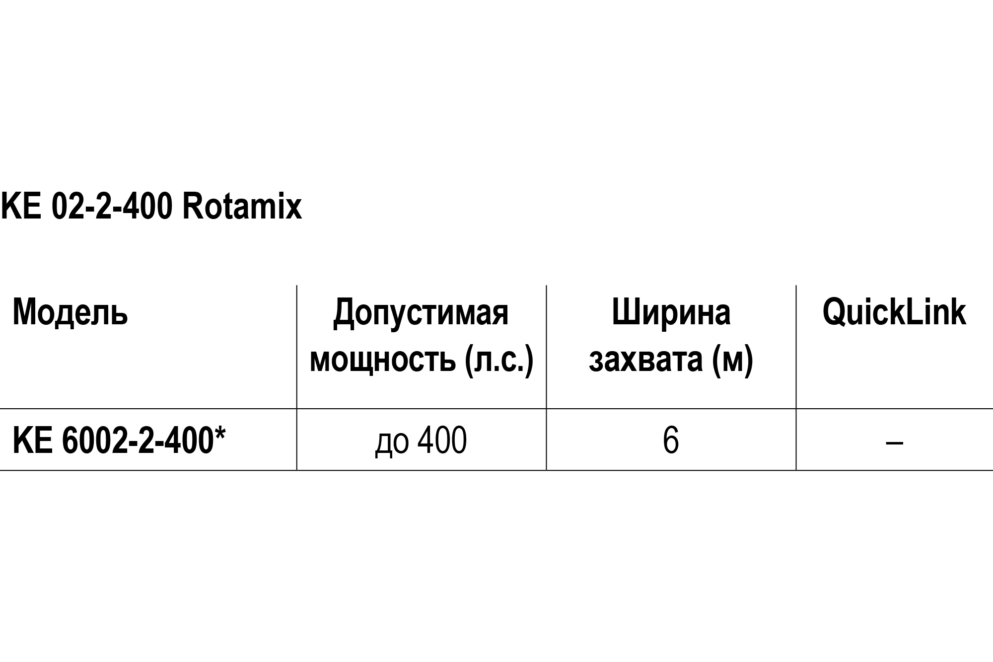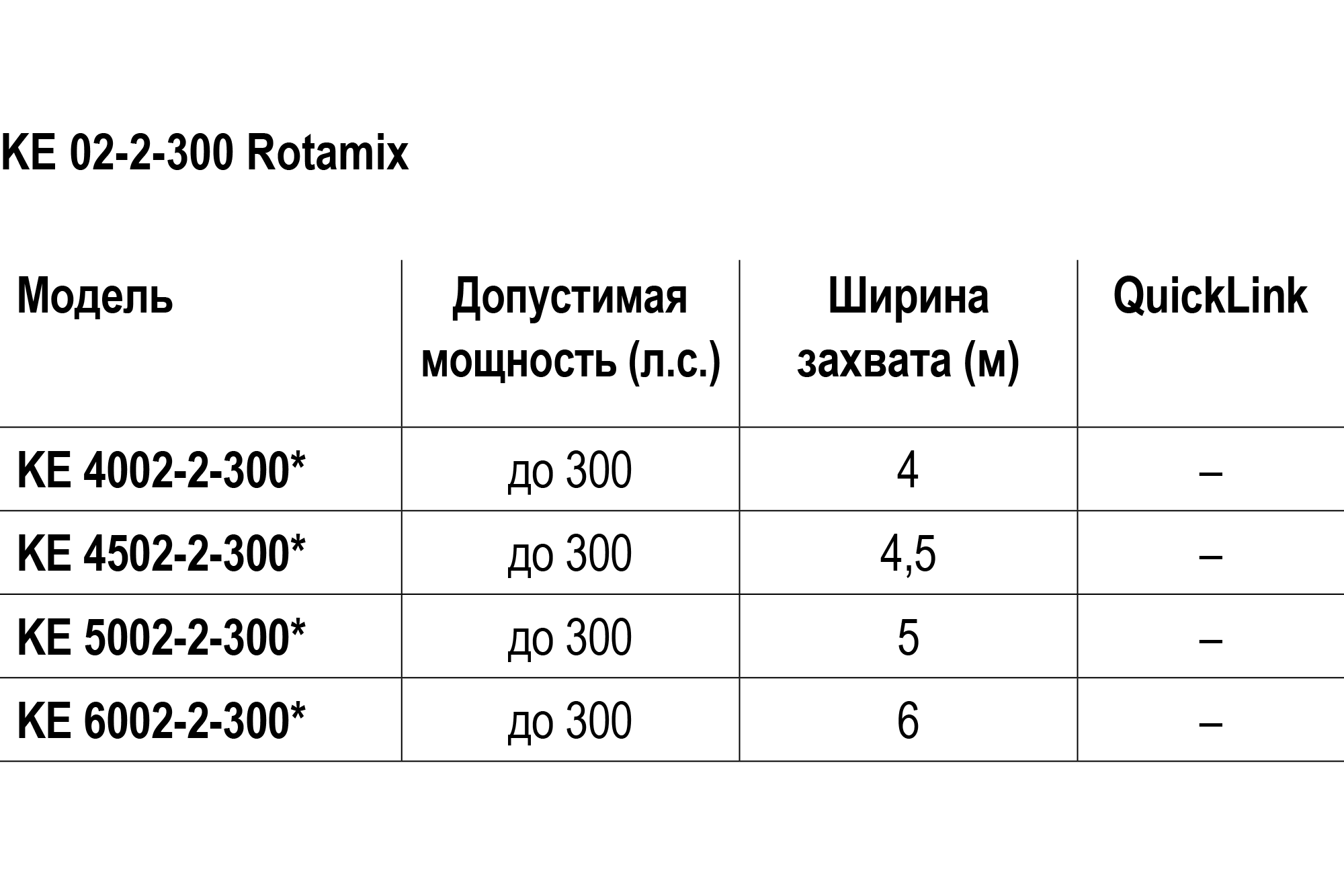 Модели KE 4002-2-300, KE 4502-2-300, KE 5002-2-300, KE 6002-2-300 и KE 6002-2-400 от компании AMAZONE – это новые машины, гарантирующие, прежде всего, высокую производительность по площади. Благодаря ширине захвата до 6 м ротационная борона обеспечивает высокую производительность. Быстрое складывание на транспортную ширину 3 м обеспечивает также быстрый и безопасный переход с одного участка на другой. Машины предназначены для использования с навесной посевной комбинацией Avant 02. Машины с шириной захвата 4,5 м могут дополнительно применяться с сеялкой точного высева Precea.