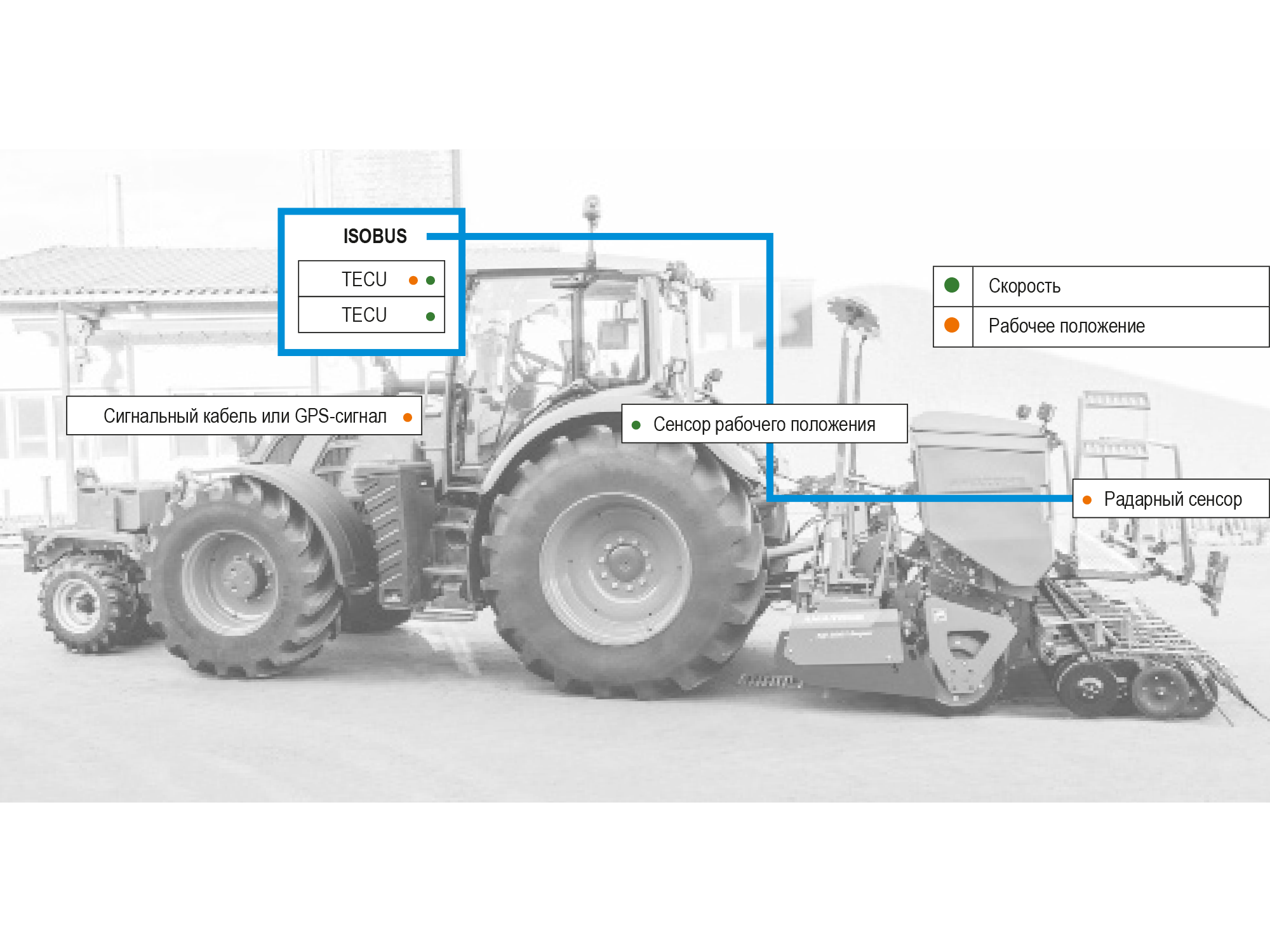 Для определения скорости на Cataya используются различные источники. Наряду с радарным сенсором или сигналом GPS может быть использован также сигнал скорости трактора. Сервопривод позволяет свободно выбирать как сигнал скорости, так и сигнал рабочего положения.