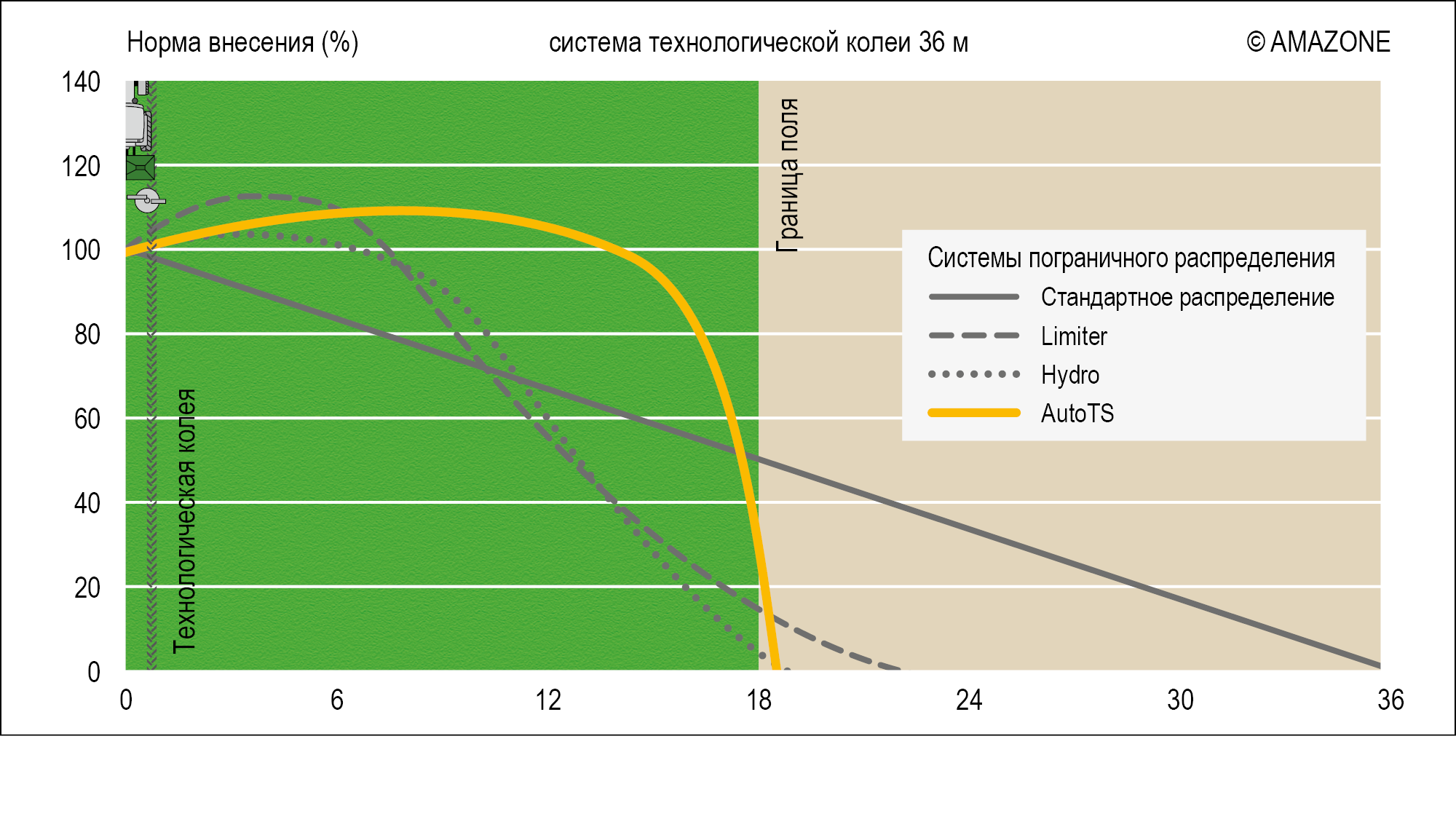 Распределительное устройство разработано с трехмерными картинами распределения для обеспечения идеального поперечного распределения при ширине захвата до 54 м. Большие зоны перекрытий обеспечивают идеальную картину распределения и значительно устойчивее против всех внешних факторов, как например, боковой ветер, уклон, влажность воздуха и переменное качество удобрений.