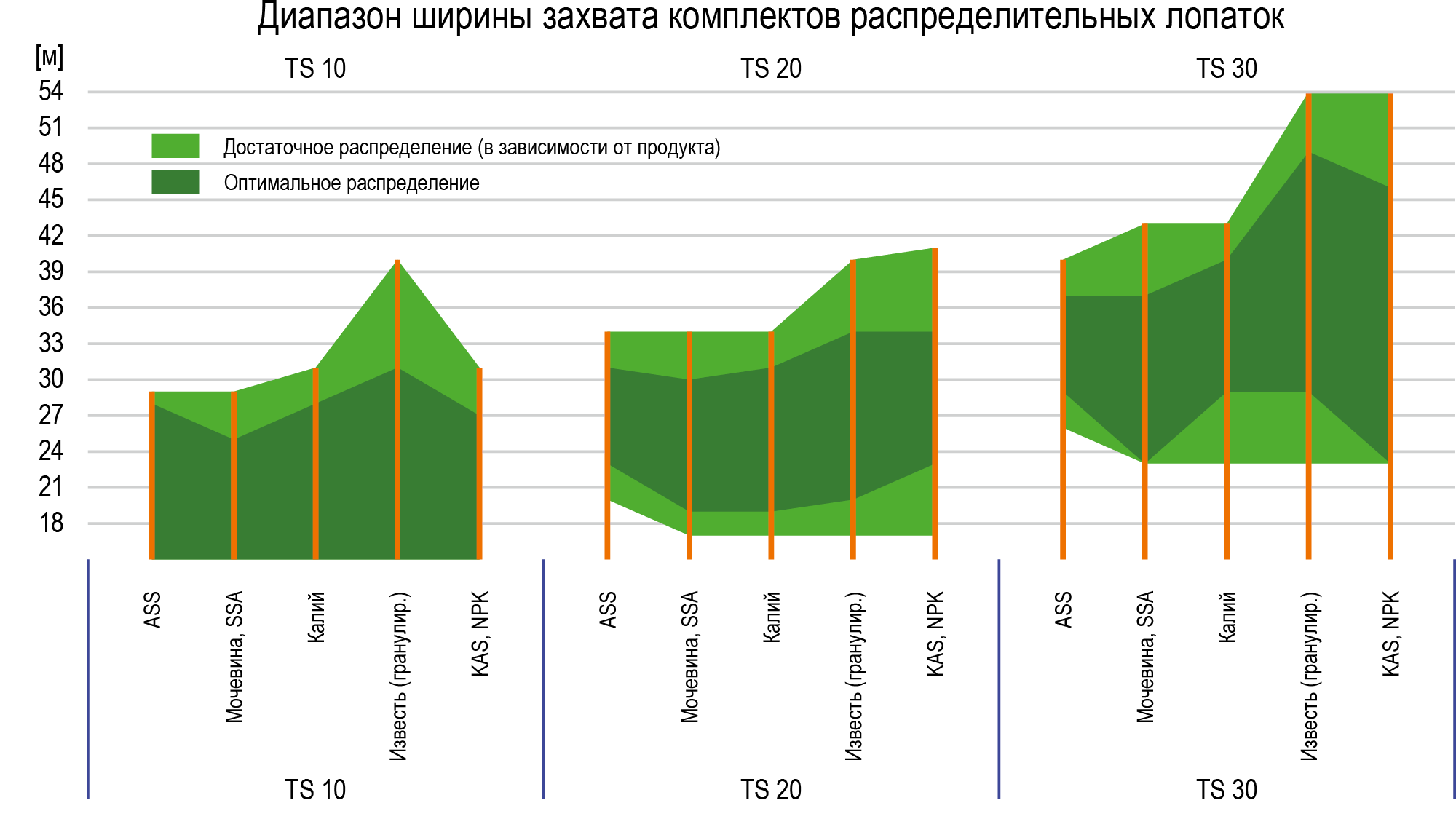 За счет особой формы и наклона распределительных лопаток при работе с распределительным устройством TS образуется мульти-веер распределения. Так, веера распределения от длинных и коротких лопаток не влияют друг на друга и формируют свою оптимальную траекторию.
