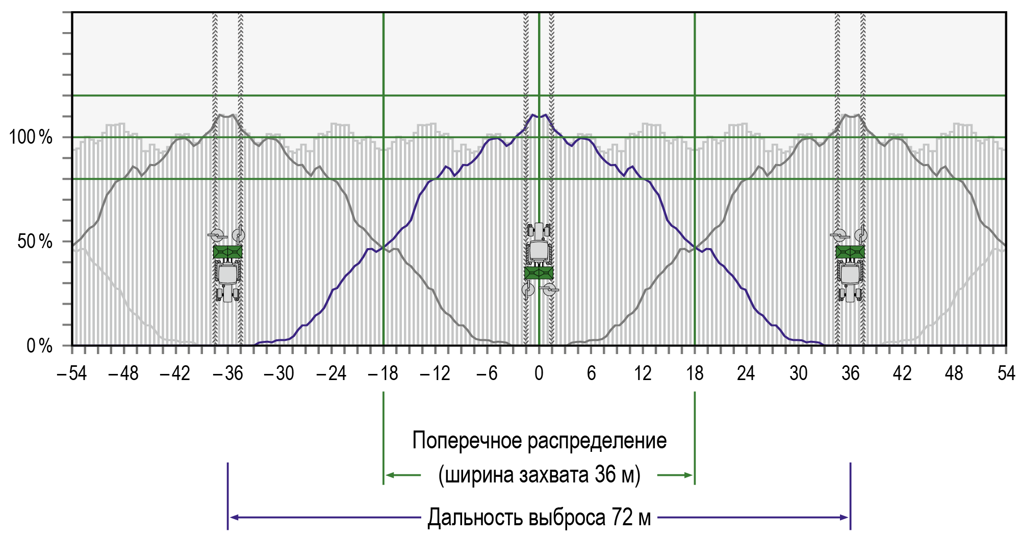Благодаря специальным форме и изгибу разбрасывающих лопаток образуется многосекционный веер. Оптимизированная траектория выброса и большие перекрытия удобрений обеспечивают устойчивость распределителя к изменению наклона и высоты.