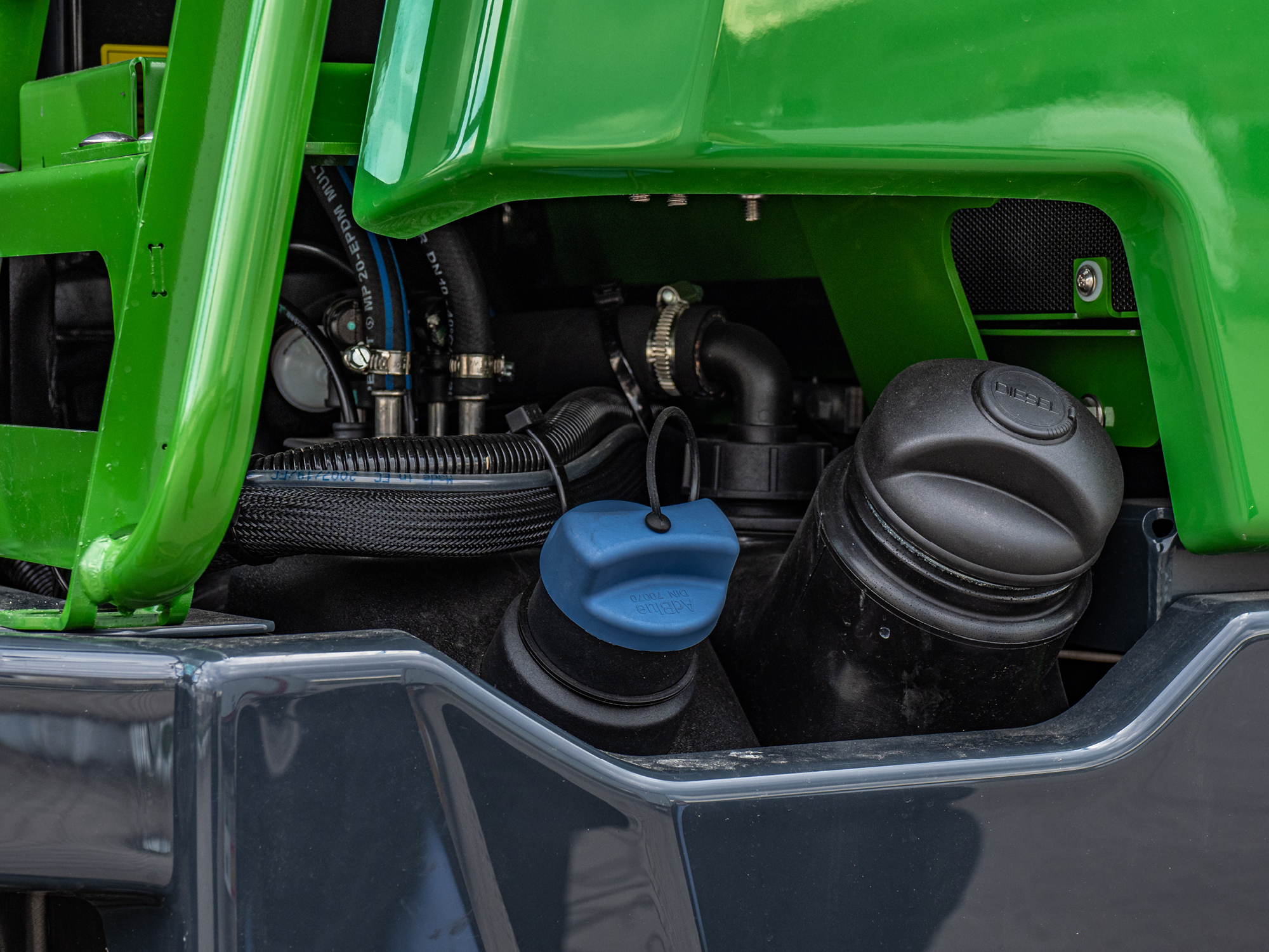 С мотором с нормой токсичности 5 AMAZONE использует систему рециркуляции отработавших газов с катализатором окисления дизельного топлива и сажевый фильтр – это бережет окружающую среду. Сажевый фильтр во время работы постоянно регенерируется. SCR-катализатор с помощью впрыскивания DEF-реагента (Diesel-Exhaust-Fluid) снижает содержание окиси азота. Новый DEF-бак 20 л находится рядом с топливным баком 290 л. Расход DEF-реагента составляет около 2,5 процента от расхода топлива. Это означает, что DEF нужно добавлять во время каждой 3 или 4 заправки.