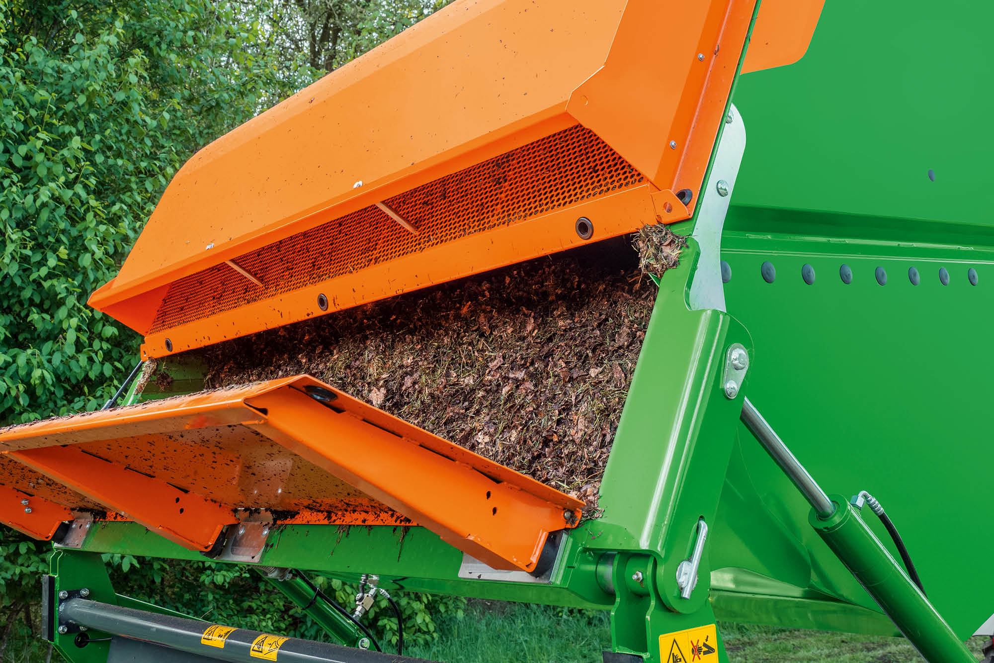 Поток воздуха направляет скошенный материал в большой бункер-накопитель. Щиток, расположенный внутри бункера, защищает переднюю часть крышки от удара камней. Так предотвращаются повреждения на машине.