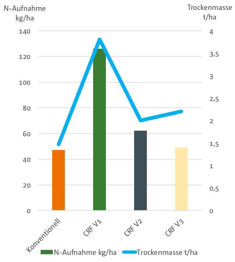 Die Ausbringung des N-Düngers auf die Reihe in den CRF-Varianten zeigte Wirkung, gemäß Messung mit dem Yara-N-Tester wiesen die Pflanzen eine höhere N-Konzentration auf als die Pflanzen auf dem konventionellen Teilstück. Die sich daraus ergebende Düngeempfehlung war um die Hälfte geringer.