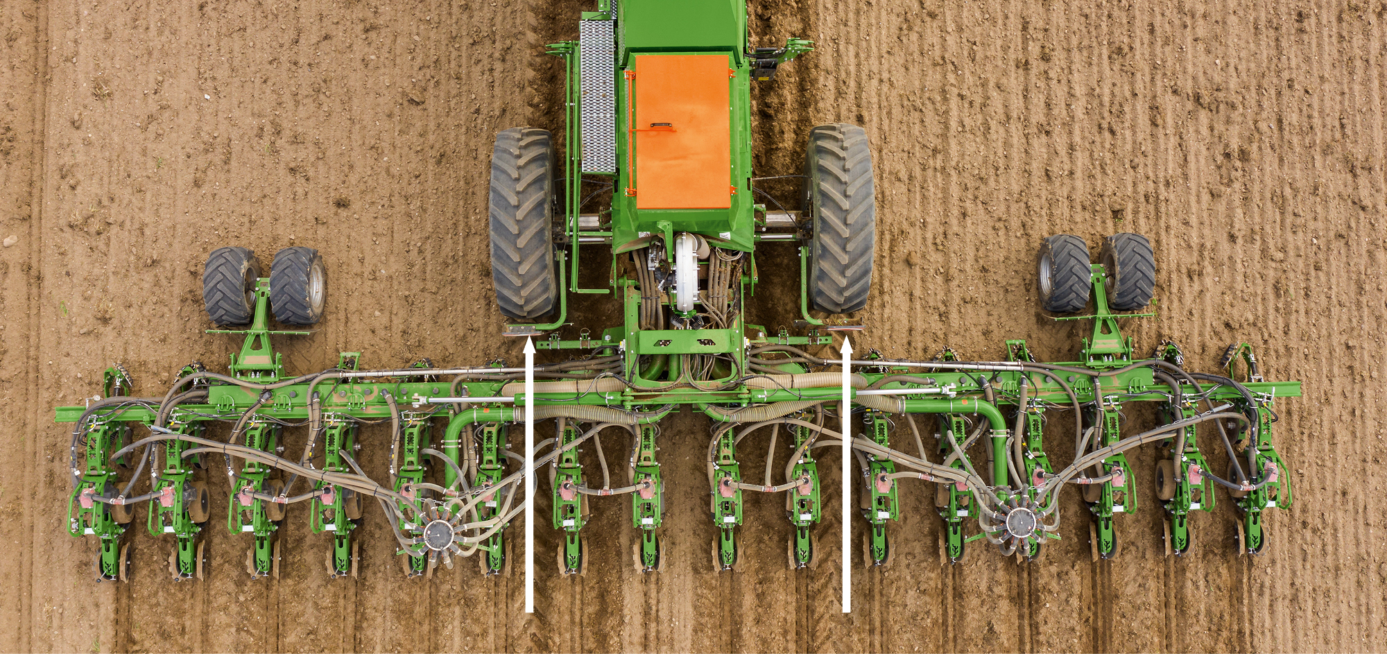 L’entraînement électrique de distribution ElectricDrive permet de régler le nombre de pieds souhaités par hectare sur le terminal ISOBUS. Cela assure la régularité du dosage au travers des coupures de tronçons par GPS et des cartes de modulation de doses. Par ailleurs, Section Control optimise l’économie de semence par rang dans les pointes et en fourrière. De plus, les conditions sont idéales pour la lutte mécanique contre les adventices avec la bineuse.